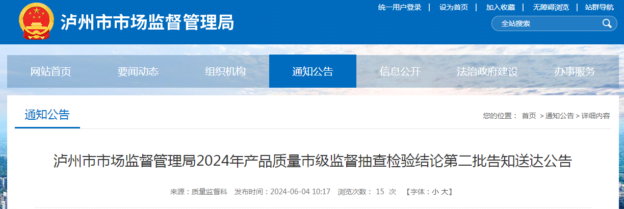 瀘州市市場監(jiān)督管理局2024年產(chǎn)品質(zhì)量市級監(jiān)督抽查檢驗結(jié)論第二批告知送達(dá)公告