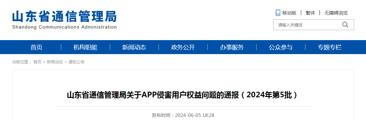 山東省通信管理局關(guān)于APP侵害用戶權(quán)益問題的通報(2024年第5批)