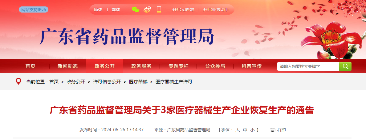 廣東省藥品監(jiān)督管理局關(guān)于3家醫(yī)療器械生產(chǎn)企業(yè)恢復(fù)生產(chǎn)的通告