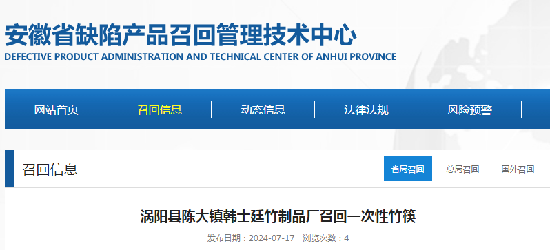日前,渦陽縣陳大鎮(zhèn)韓士廷竹制品廠按照《消費(fèi)品召回管理暫行規(guī)定》的要求,向安徽省市場監(jiān)督管理局、亳州市市場監(jiān)督管理局報(bào)告了召回計(jì)劃,將自即日起,召回2024年4月10日制造的5.5型號(hào)一次性竹筷,涉及數(shù)量為5000包。