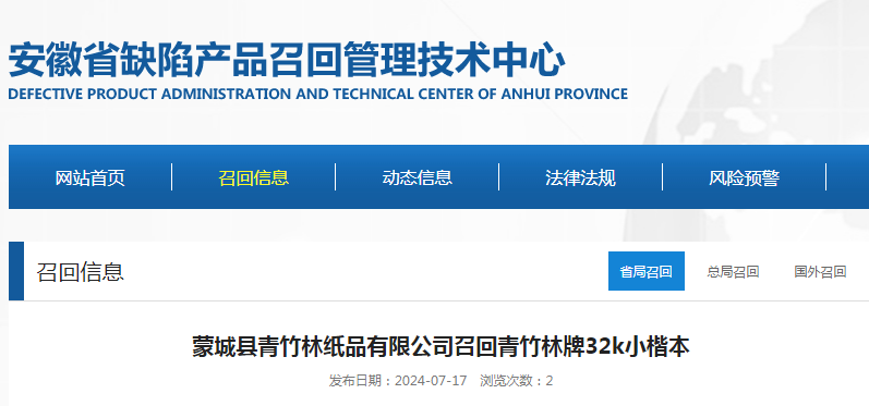 日前,蒙城縣青竹林紙品有限公司按照《消費(fèi)品召回管理暫行規(guī)定》的要求,向安徽省市場監(jiān)督管理局、亳州市市場監(jiān)督管理局報告了召回計劃,將自即日起,召回2024年4月5日至4月6日生產(chǎn)的青竹林牌32k小楷本,涉及數(shù)量45000本。