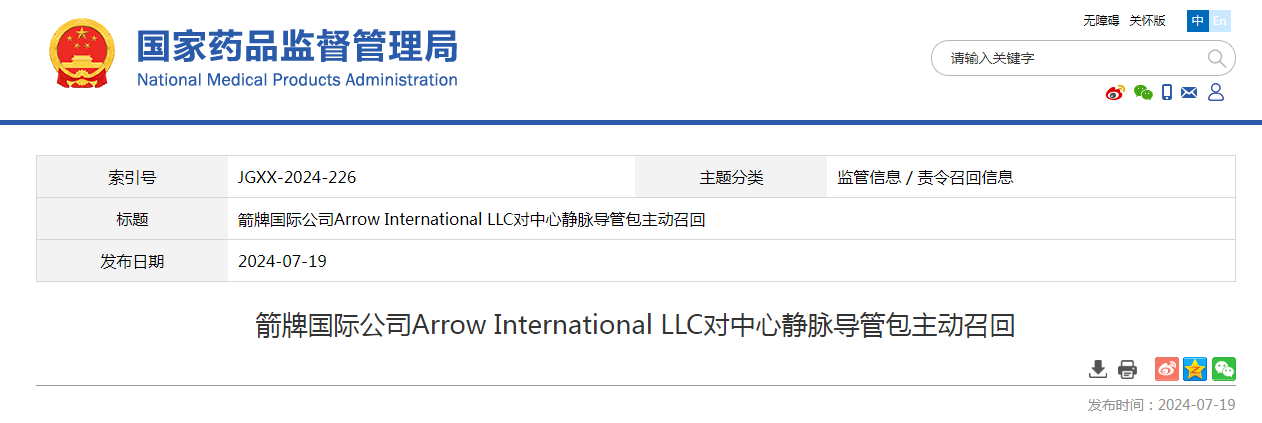 泰利福醫(yī)療器械商貿(mào)(上海)有限公司報(bào)告,由于注射器組件正在注冊(cè)的原因,生產(chǎn)商箭牌國際公司Arrow International LLC 對(duì)其生產(chǎn)的中心靜脈導(dǎo)管包Central Venous Catheter Kits and Sets(國械注進(jìn)20183772034)主動(dòng)召回。本次召回涉及的產(chǎn)品未進(jìn)口至中國,具體型號(hào)、規(guī)格及批次等詳細(xì)信息見《醫(yī)療器械召回事件報(bào)告表》。