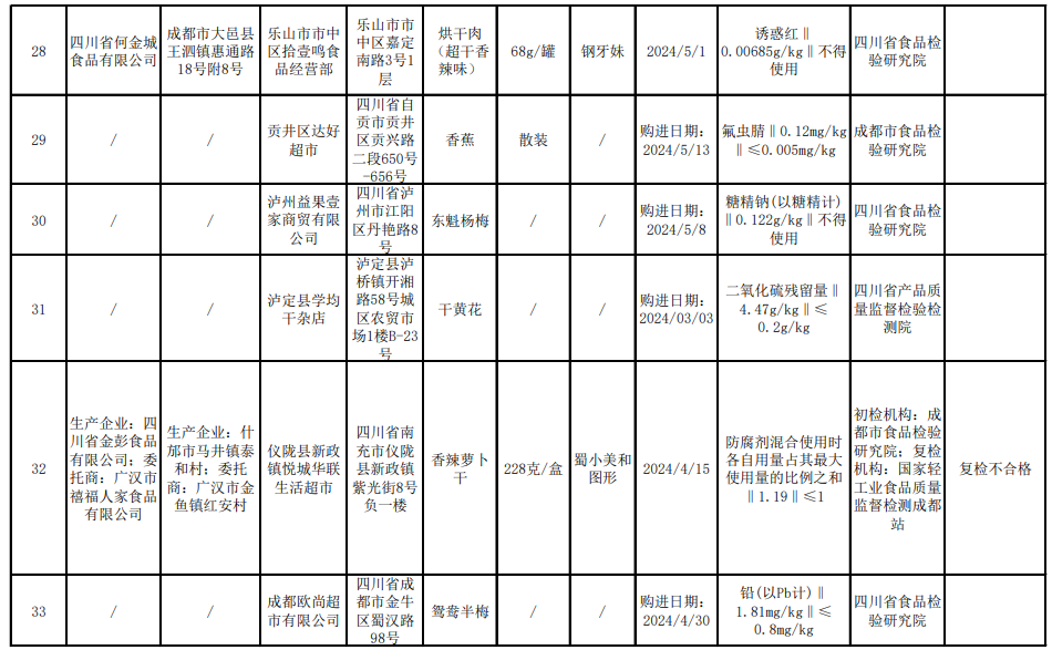 對(duì)抽檢中發(fā)現(xiàn)的不合格食品,省市場(chǎng)監(jiān)督管理局已責(zé)成成都市、自貢市、攀枝花市、瀘州市、德陽(yáng)市、綿陽(yáng)市、遂寧市、內(nèi)江市、樂(lè)山市、南充市、宜賓市、達(dá)州市、巴中市、雅安市、阿壩州、甘孜州市場(chǎng)監(jiān)督管理局立即組織開展核查處置,督促食品生產(chǎn)企業(yè)查清產(chǎn)品流向,采取下架召回不合格產(chǎn)品等措施控制風(fēng)險(xiǎn);對(duì)違法違規(guī)行為,依法從嚴(yán)處理;及時(shí)將企業(yè)采取的風(fēng)險(xiǎn)防控措施和核查處置情況向社會(huì)公開。