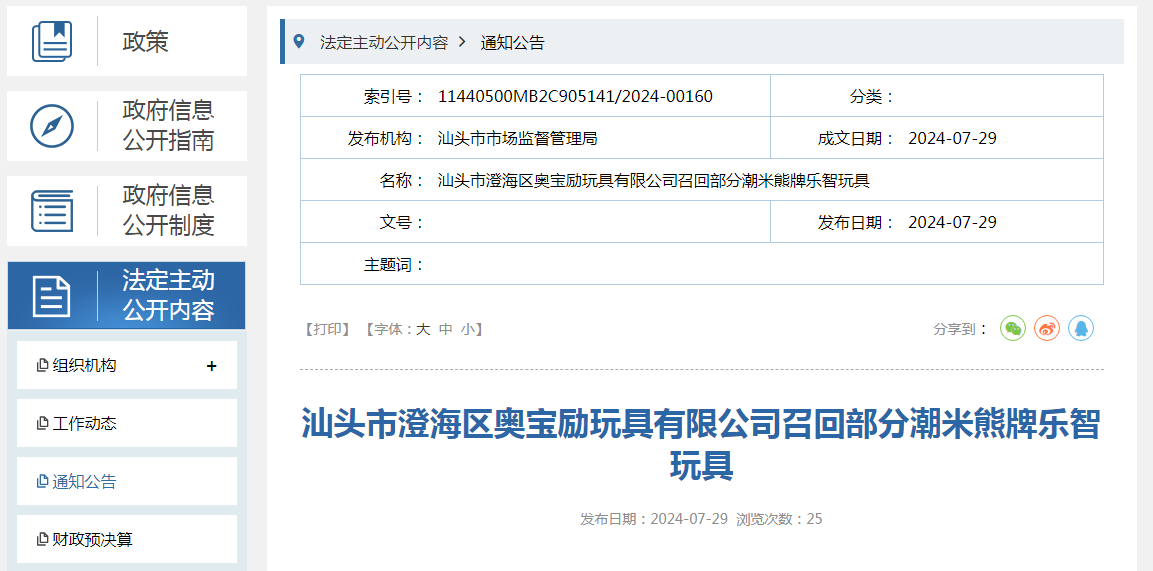 日前,汕頭市澄海區(qū)奧寶勵(lì)玩具有限公司按照《消費(fèi)品召回管理暫行規(guī)定》的要求,主動向汕頭市市場監(jiān)督管理局報(bào)告了召回計(jì)劃,將自即日起,召回2022年7月20日制造的部分潮米熊牌樂智玩具,型號:NO.389-5,涉及數(shù)量為432只。