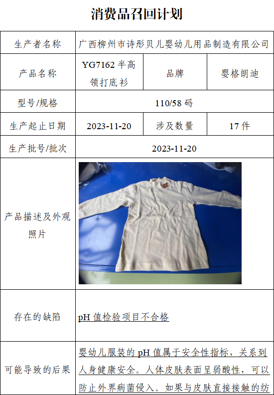 日前,廣西柳州市詩彤貝兒嬰幼兒用品制造有限公司受缺陷調(diào)查影響按照《消費品召回管理暫行規(guī)定》的要求,主動向廣西壯族自治區(qū)市場監(jiān)督管理局報告了召回計劃,將自即日起,召回2023年11月20日生產(chǎn)的嬰格朗迪YG7162半高領(lǐng)打底衫產(chǎn)品,生產(chǎn)批號/批次為2023-11-20,型號規(guī)格為110/58,涉及數(shù)量為17件。