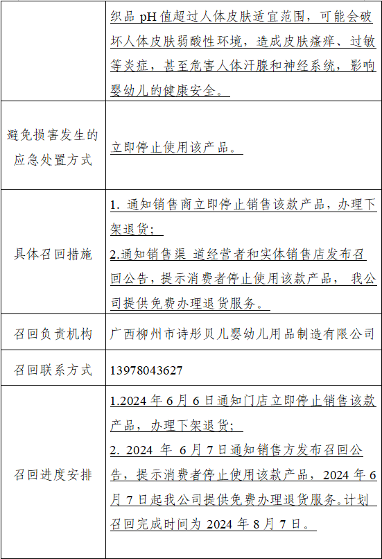 本次召回范圍內(nèi)的半高領(lǐng)打底衫,pH值不符合GB 31701-2015 《嬰幼兒及兒童紡織產(chǎn)品安全技術(shù)規(guī)范》的要求,pH值超標可能會導致過敏等一系列不良的反應(yīng),影響嬰幼兒的健康安全。廣西柳州市詩彤貝兒嬰幼兒用品制造有限公司已通知門店停止銷售該批產(chǎn)品,并在公司旗下門店張貼召回公告,提示持有受影響產(chǎn)品的消費者停止使用該產(chǎn)品,并聯(lián)系公司旗下門店免費退貨,消費者可通過客戶服務(wù)熱線(13978043627)了解持有的產(chǎn)品是否在受影響范圍內(nèi)及相關(guān)具體情況。