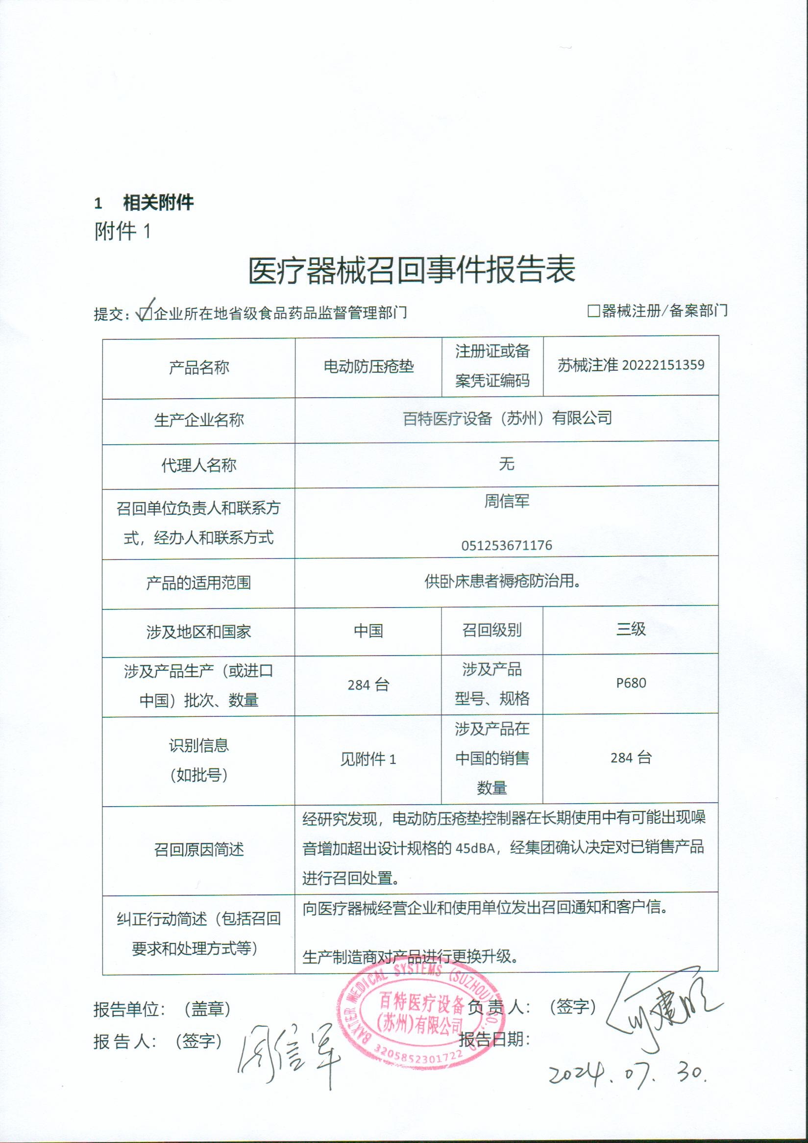 百特醫(yī)療設(shè)備(蘇州)有限公司報(bào)告,由于控制器在長期使用后可能出現(xiàn)噪聲超出設(shè)計(jì)規(guī)格45dB(A)的情況,該企業(yè)對(duì)其生產(chǎn)的電動(dòng)防壓瘡墊主動(dòng)召回。召回級(jí)別為三級(jí)。涉及產(chǎn)品的型號(hào)、規(guī)格及批次等詳細(xì)信息見《醫(yī)療器械召回事件報(bào)告表》。