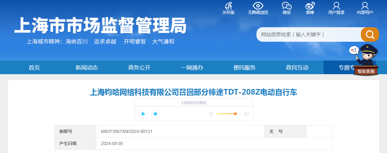 上海鈞哈網(wǎng)絡科技有限公司召回部分棒途TDT-208Z電動自行車