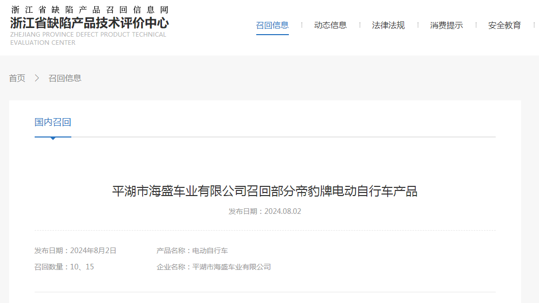 日前,平湖市海盛車業(yè)有限公司按照《消費品召回管理暫行規(guī)定》的要求,主動向浙江省市場監(jiān)督管理局和嘉興市市場監(jiān)督管理局報告了召回計劃,將自即日起,召回2023年1月4日至2023年2月4日期間制造的部分帝豹牌TDT110Z型號電動自行車,涉及數(shù)量為10輛,召回2023年9月29日至2023年10月23日期間制造的部分帝豹牌TDT120Z型號電動自行車,涉及數(shù)量為15輛。
