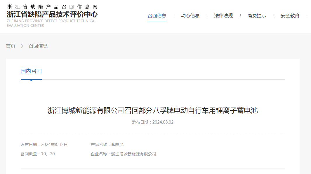 浙江博城新能源有限公司召回部分八孚牌電動自行車用鋰離子蓄電池