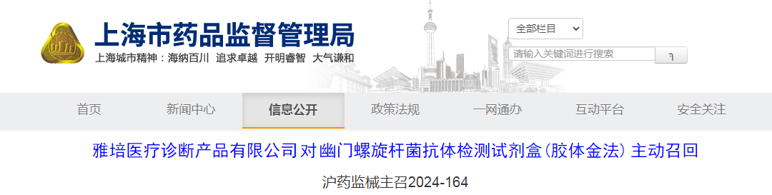 雅培醫(yī)療診斷產(chǎn)品有限公司對(duì)幽門螺旋桿菌抗體檢測(cè)試劑盒(膠體金法)主動(dòng)召回