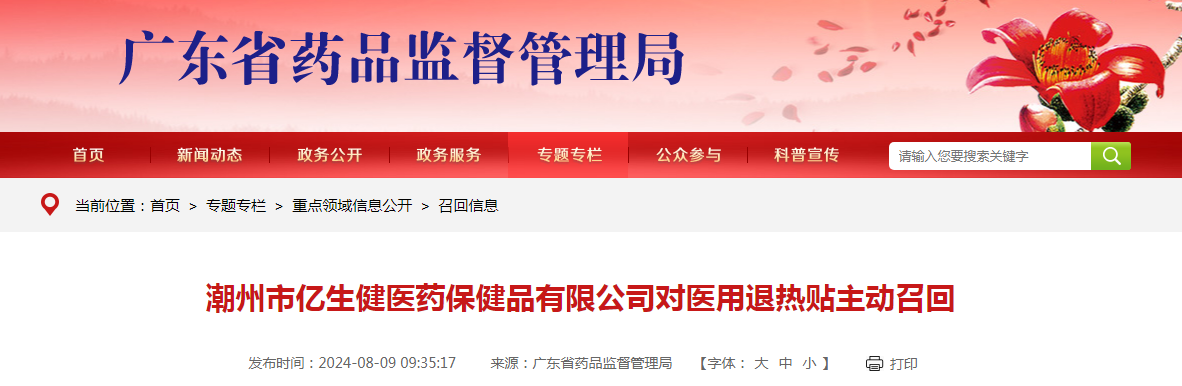 中國質(zhì)量新聞網(wǎng)訊 據(jù)廣東省藥品監(jiān)督管理局網(wǎng)站消息,潮州市億生健醫(yī)藥保健品有限公司生產(chǎn)的醫(yī)用退熱貼,生產(chǎn)批號20245027、20240625,因原材料聚丙烯酸鈉實(shí)際生產(chǎn)中所使用規(guī)格型號與經(jīng)備案的產(chǎn)品標(biāo)簽標(biāo)識不一致,潮州市億生健醫(yī)藥保健品有限公司決定發(fā)起主動召回。