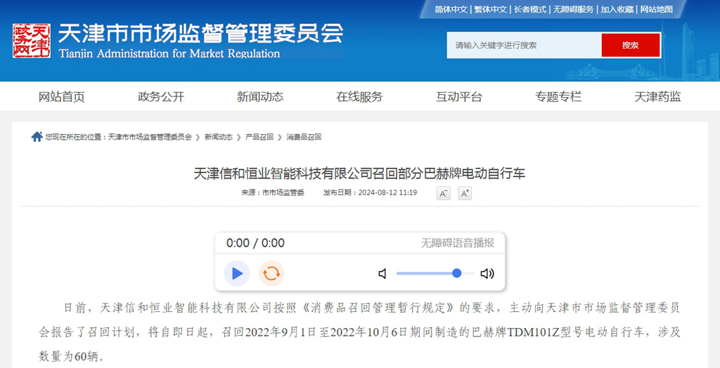 中國質量新聞網(wǎng)訊 據(jù)天津市市場監(jiān)督管理委員會網(wǎng)站8月12日消息,日前,天津信和恒業(yè)智能科技有限公司按照《消費品召回管理暫行規(guī)定》的要求,主動向天津市市場監(jiān)督管理委員會報告了召回計劃,將自即日起,召回2022年9月1日至2022年10月6日期間制造的巴赫牌TDM101Z型號電動自行車,涉及數(shù)量為60輛。