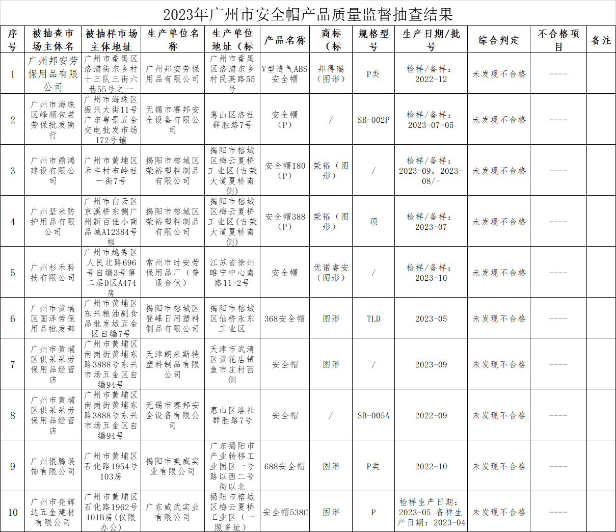 附件:2023年廣州市安全帽產(chǎn)品質(zhì)量監(jiān)督抽查結(jié)果