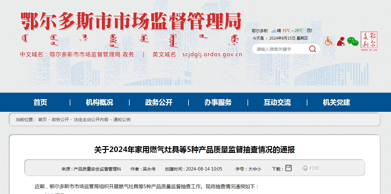 中國(guó)質(zhì)量新聞網(wǎng)訊 8月14日,鄂爾多斯市市場(chǎng)監(jiān)督管理局網(wǎng)站發(fā)布關(guān)于2024年家用燃?xì)庠罹叩?種產(chǎn)品質(zhì)量監(jiān)督抽查情況的通報(bào)。通報(bào)顯示,近期,內(nèi)蒙古鄂爾多斯市市場(chǎng)監(jiān)管局組織開(kāi)展燃?xì)庠罹叩?種產(chǎn)品質(zhì)量監(jiān)督抽查工作。抽查情況通報(bào)如下: