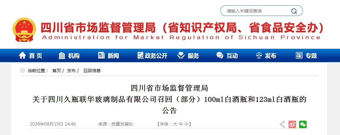 中國質(zhì)量新聞網(wǎng)訊 8月19日,四川省市場監(jiān)督管理局網(wǎng)站發(fā)布關(guān)于四川久瓶聯(lián)華玻璃制品有限公司召回(部分)100ml白酒瓶和123ml白酒瓶的公告。