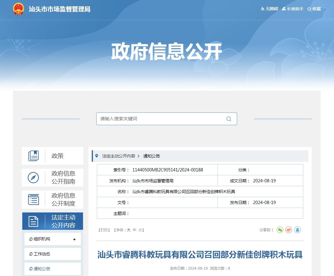 中國質(zhì)量新聞網(wǎng)訊 據(jù)汕頭市市場監(jiān)督管理局網(wǎng)站8月19日消息,日前,汕頭市睿騰科教玩具有限公司按照《消費品召回管理暫行規(guī)定》的要求,主動向汕頭市市場監(jiān)督管理局報告了召回計劃,將自即日起,召回2022年8月期間制造的部分新佳創(chuàng)牌積木玩具,型號:7999,涉及數(shù)量為384套。