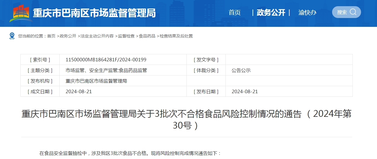 在食品安全監(jiān)督抽檢中,涉及我區(qū)3批次食品不合格。現(xiàn)將風(fēng)險(xiǎn)控制完成情況通告如下: