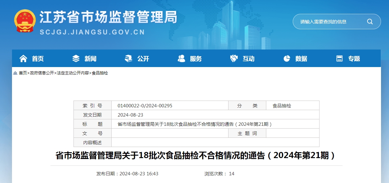 近期,江蘇省市場(chǎng)監(jiān)督管理局組織食品安全抽檢,抽取蜂產(chǎn)品、食品添加劑、糖果制品、薯類(lèi)和膨化食品、餅干、調(diào)味品、酒類(lèi)、糧食加工品、茶葉及相關(guān)制品、蔬菜制品、水果制品、乳制品、糕點(diǎn)、速凍食品、食用油、油脂及其制品、飲料、食用農(nóng)產(chǎn)品、炒貨食品及堅(jiān)果制品、肉制品和餐飲食品等20大類(lèi)食品1000批次樣品,檢出其中餅干、餐飲食品、茶葉及相關(guān)制品、炒貨食品及堅(jiān)果制品、糕點(diǎn)、食用農(nóng)產(chǎn)品和水果制品等7大類(lèi)食品18批次樣品不合格。具體情況通告如下:
