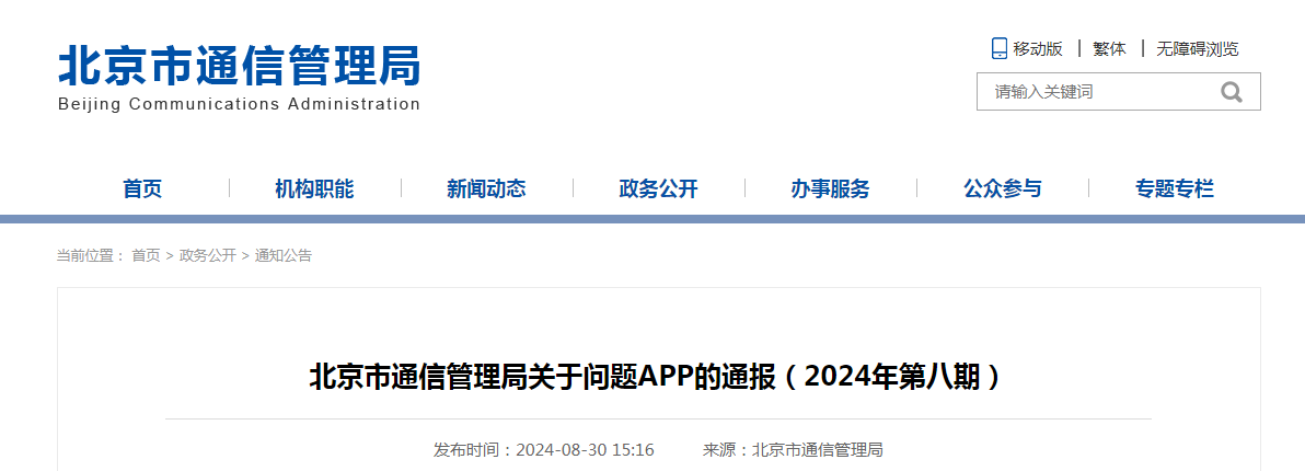 北京市通信管理局關(guān)于問題APP的通報(2024年第八期)