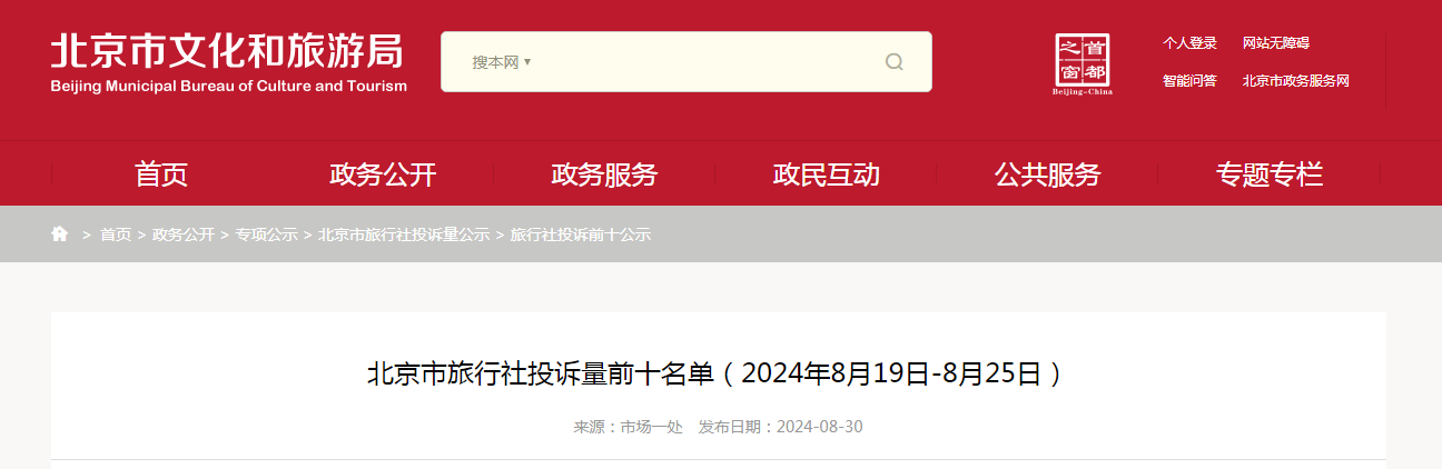 北京市旅行社投訴量前十名單(2024年8月19日-8月25日)
