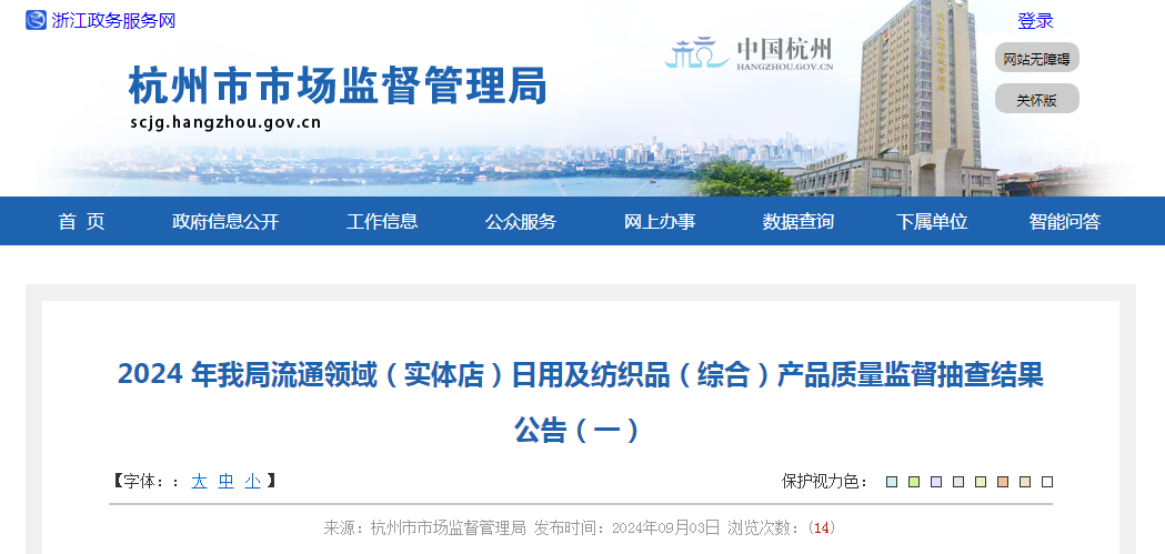 中國質(zhì)量新聞網(wǎng)訊 近日,杭州市市場監(jiān)督管理局發(fā)布2024年流通領(lǐng)域(實體店)日用及紡織品(綜合)產(chǎn)品質(zhì)量監(jiān)督抽查結(jié)果公告(一)。