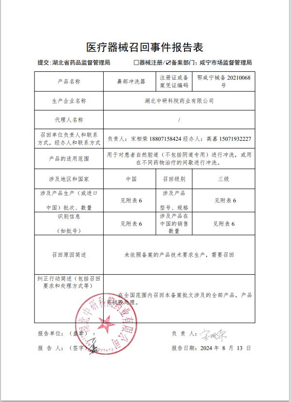 湖北中研科院藥業(yè)有限公司報(bào)告,由于未依照備案的產(chǎn)品技術(shù)要求生產(chǎn)等原因,湖北中研科院藥業(yè)有限公司對(duì)其生產(chǎn)的鼻部沖洗器(備案號(hào): 鄂咸寧械備20210068號(hào))主動(dòng)召回。召回級(jí)別為三級(jí)。涉及產(chǎn)品的型號(hào)、規(guī)格及批次等詳細(xì)信息見《醫(yī)療器械召回事件報(bào)告表》。
