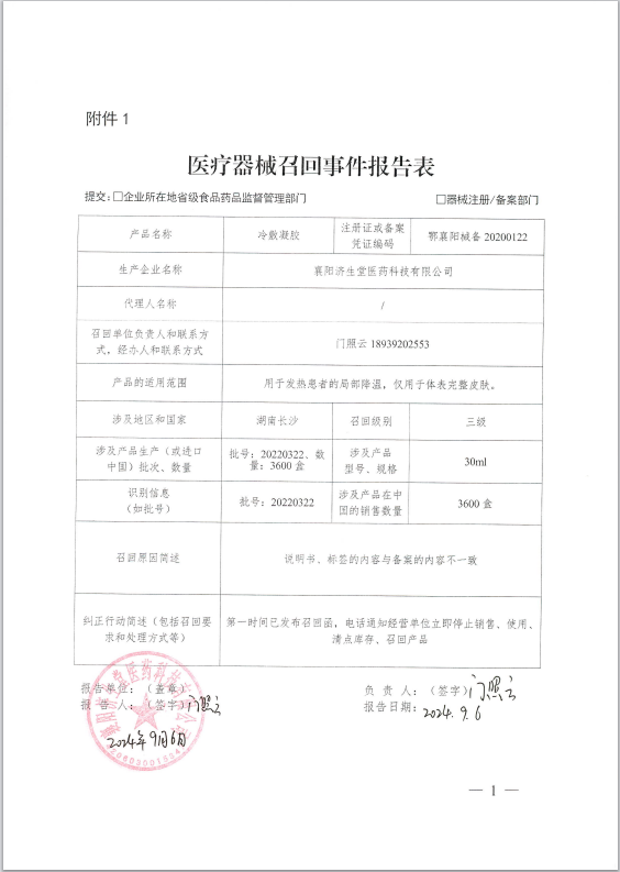 襄陽(yáng)濟(jì)生堂醫(yī)藥科技有限公司報(bào)告,由于說(shuō)明書(shū)、標(biāo)簽的內(nèi)容與備案的內(nèi)容不一致等原因,襄陽(yáng)濟(jì)生堂醫(yī)藥科技有限公司對(duì)其生產(chǎn)的冷敷凝膠(備案號(hào): 鄂襄陽(yáng)械備20200122號(hào))主動(dòng)召回。召回級(jí)別為三級(jí)。涉及產(chǎn)品的型號(hào)、規(guī)格及批次等詳細(xì)信息見(jiàn)《醫(yī)療器械召回事件報(bào)告表》。