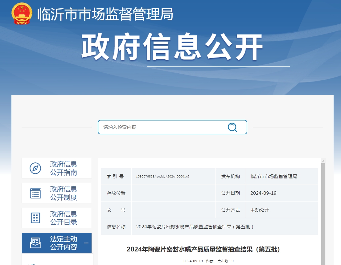 中國質(zhì)量新聞網(wǎng)訊 9月19日,從臨沂市市場監(jiān)督管理局網(wǎng)站獲悉,山東省臨沂市2024年第五批產(chǎn)品質(zhì)量市級監(jiān)督抽查共抽查陶瓷片密封水嘴產(chǎn)品10批次,其中,生產(chǎn)領(lǐng)域2批次,流通領(lǐng)域8批次。