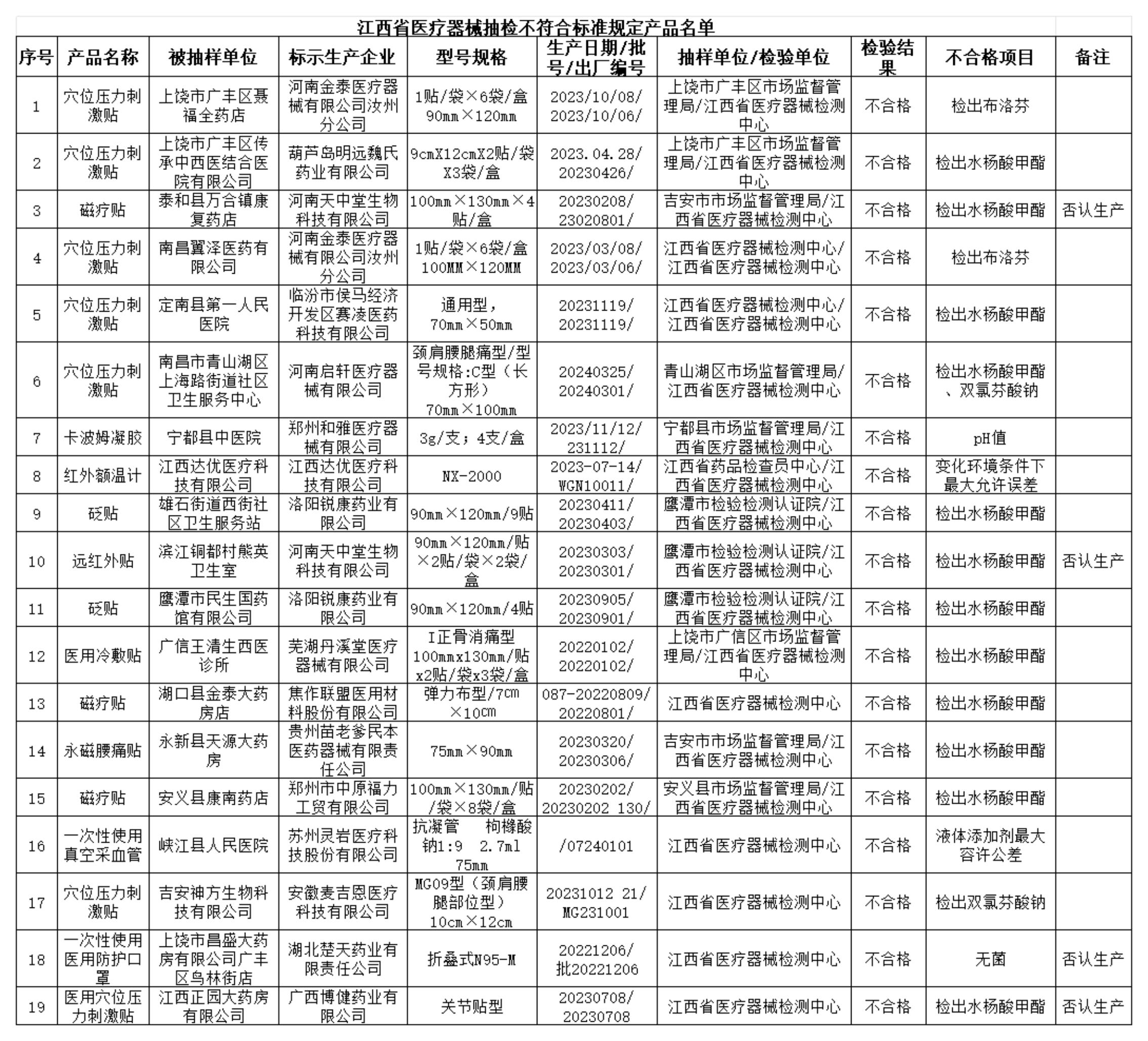 19 | 醫(yī)用穴位壓 | 江西正園大藥房 | 廣西博健藥業(yè)有 | 關節(jié)貼型 | 20230708/ | 江西省醫(yī)療器械檢測中心 | 不合格 | 檢出水楊酸甲酯 | 否認生產(chǎn) |