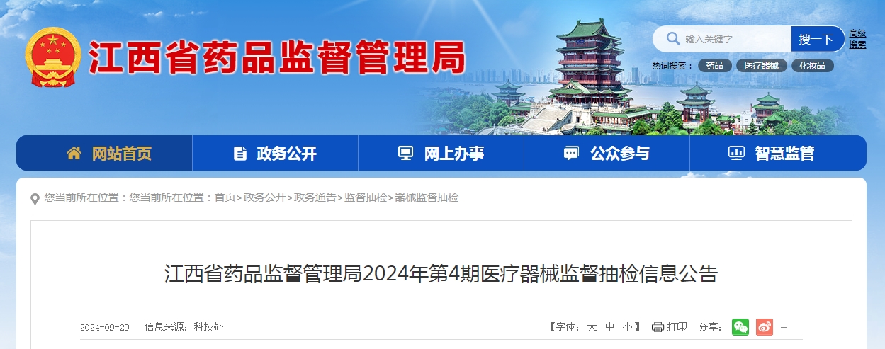為加強醫(yī)療器械質量監(jiān)督管理,保障醫(yī)療器械產(chǎn)品使用安全有效,江西省藥品監(jiān)督管理局按照2024年度全省醫(yī)療器械抽檢工作方案,持續(xù)對本省醫(yī)療器械生產(chǎn)、經(jīng)營和使用環(huán)節(jié)實施了監(jiān)督抽樣檢驗。信息如下:
