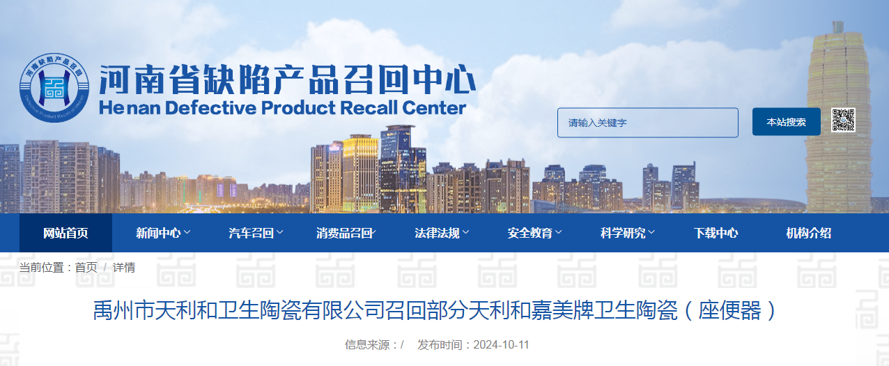 中國(guó)質(zhì)量新聞網(wǎng)訊 據(jù)河南省缺陷產(chǎn)品召回中心網(wǎng)站消息,日前,禹州市天利和衛(wèi)生陶瓷有限公司按照《消費(fèi)品召回管理暫行規(guī)定》的要求,主動(dòng)向河南省市場(chǎng)監(jiān)督管理局、許昌市市場(chǎng)監(jiān)督管理局報(bào)告了召回計(jì)劃,將自即日起,召回2023年2月16日制造的部分天利和嘉美牌衛(wèi)生陶瓷(座便器)(型號(hào)/規(guī)格606連體),涉及數(shù)量60件。