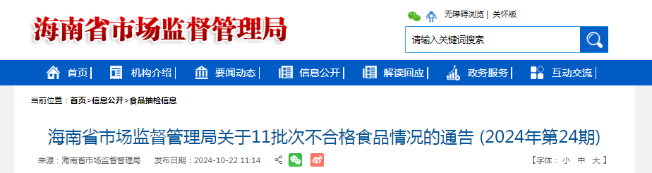 海南省市場監(jiān)督管理局關(guān)于11批次不合格食品情況的通告(2024年第24期)