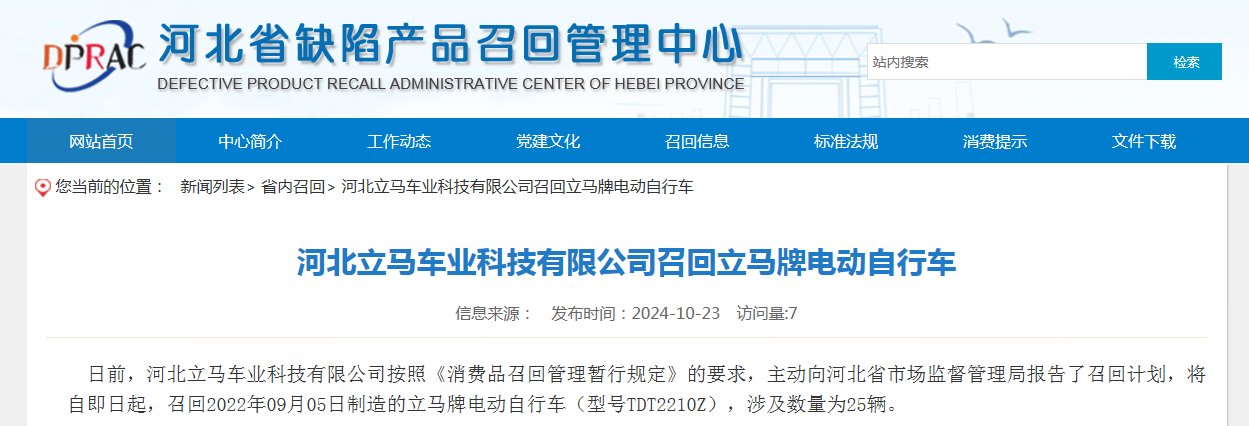 中國質(zhì)量新聞網(wǎng)訊 據(jù)河北省缺陷產(chǎn)品召回管理中心網(wǎng)站消息,日前,河北立馬車業(yè)科技有限公司按照《消費(fèi)品召回管理暫行規(guī)定》的要求,主動向河北省市場監(jiān)督管理局報告了召回計劃,將自即日起,召回2022年09月05日制造的立馬牌電動自行車(型號TDT2210Z),涉及數(shù)量為25輛。