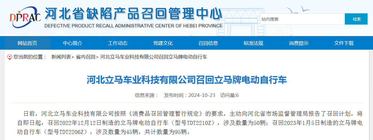 本次召回范圍內(nèi)的電動自行車由于“尺寸限值”項目不符合GB 17761-2018《電動自行車安全技術(shù)規(guī)范》標(biāo)準(zhǔn),存在危及人身財產(chǎn)安全的不合理危險;河北立馬車業(yè)科技有限公司將通過免費(fèi)為消費(fèi)者更換全新的符合安全標(biāo)準(zhǔn)要求的配件,以消除安全隱患。