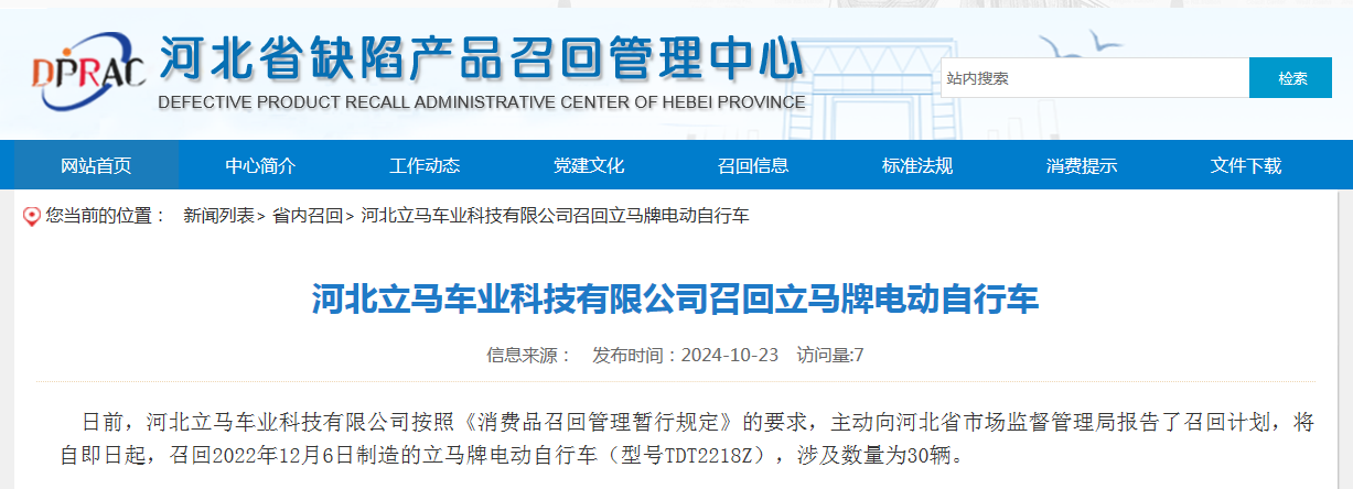 中國質(zhì)量新聞網(wǎng)訊 據(jù)河北省缺陷產(chǎn)品召回管理中心網(wǎng)站消息,日前,河北立馬車業(yè)科技有限公司按照《消費(fèi)品召回管理暫行規(guī)定》的要求,主動向河北省市場監(jiān)督管理局報告了召回計劃,將自即日起,召回2022年12月6日制造的立馬牌電動自行車(型號TDT2218Z),涉及數(shù)量為30輛。