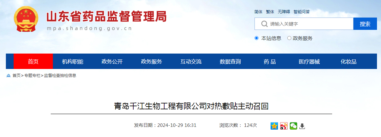 青島千江生物工程有限公司對熱敷貼主動召回