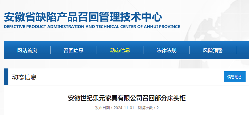 中國質(zhì)量新聞網(wǎng)訊 據(jù)安徽省缺陷產(chǎn)品召回管理技術(shù)中心網(wǎng)站消息,日前,安徽世紀(jì)樂元家具有限公司按照《消費品召回管理暫行規(guī)定》的要求,向安徽省市場監(jiān)督管理局、合肥市市場監(jiān)督管理局報告了召回計劃,將自即日起,召回2024年4月10日生產(chǎn)、400×400×500mm規(guī)格的床頭柜,涉及數(shù)量為50張。