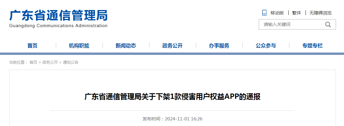 廣東省通信管理局關(guān)于下架1款侵害用戶權(quán)益APP的通報(bào)