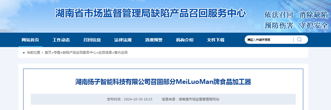 湖南揚子智能科技有限公司召回部分MeiLuoMan牌食品加工器-湖南省市場監(jiān)督管理局缺陷產品召回服務中心
