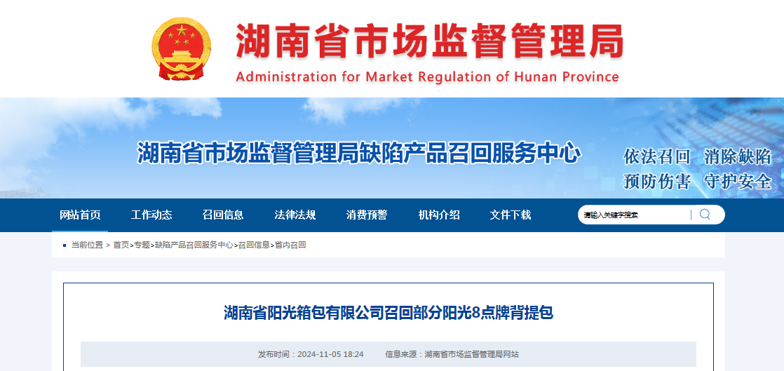 中國質(zhì)量新聞網(wǎng)訊 據(jù)湖南省市場監(jiān)督管理局缺陷產(chǎn)品召回服務(wù)中心網(wǎng)站消息,日前,湖南省陽光箱包有限公司按照《消費(fèi)品召回管理暫行規(guī)定》的要求,主動向湖南省市場監(jiān)督管理局報告了召回計(jì)劃,將自即日起,召回2023年9月期間制造的陽光8點(diǎn)牌背提包(型號/規(guī)格:49.6*32.5*16cm,90239),涉及數(shù)量為160個。