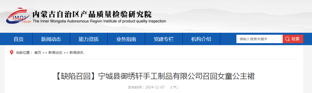 中國(guó)質(zhì)量新聞網(wǎng)訊 據(jù)內(nèi)蒙古自治區(qū)產(chǎn)品質(zhì)量檢驗(yàn)研究院網(wǎng)站消息,日前,寧城縣御繡軒手工制品有限公司按照《消費(fèi)品召回管理暫行規(guī)定》的要求,主動(dòng)向內(nèi)蒙古自治區(qū)市場(chǎng)監(jiān)督管理局報(bào)告了召回計(jì)劃,將自即日起,召回2024年8月制造的女童公主裙,涉及數(shù)量為9件。