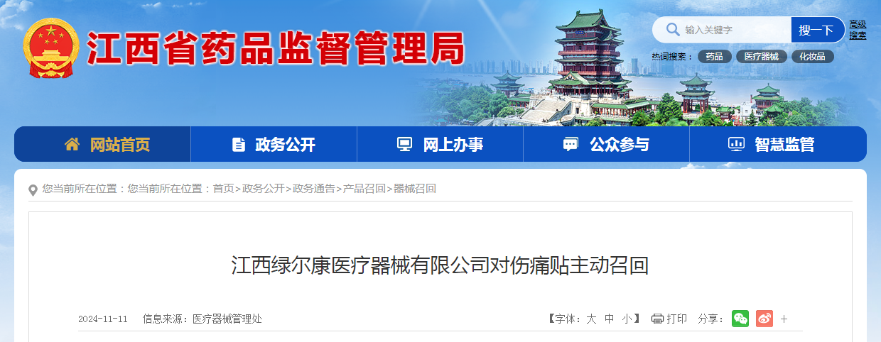 江西綠爾康醫(yī)療器械有限公司對(duì)傷痛貼主動(dòng)召回