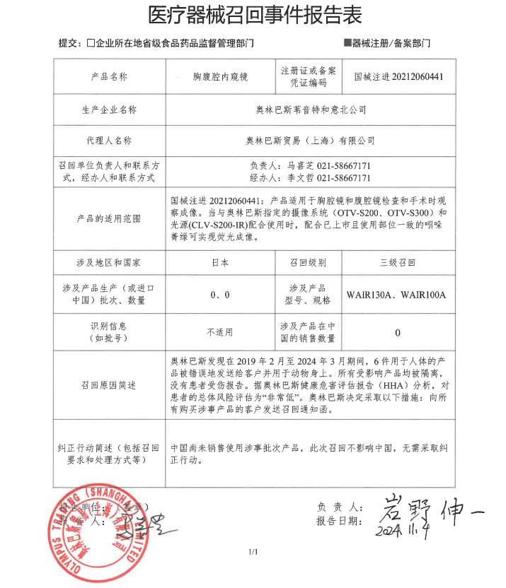 奧林巴斯貿(mào)易(上海)有限公司報(bào)告,由于產(chǎn)品被錯(cuò)誤地發(fā)送給客戶并使用的原因,生產(chǎn)商奧林巴斯葦音特和意北公司對(duì)其生產(chǎn)的胸腹腔內(nèi)窺鏡(國(guó)械注進(jìn)20212060441)主動(dòng)召回。召回級(jí)別為三級(jí)召回。本次召回涉及的產(chǎn)品未進(jìn)口至中國(guó),具體型號(hào)、規(guī)格及批次等詳細(xì)信息見(jiàn)《醫(yī)療器械召回事件報(bào)告表》?! ?/p>