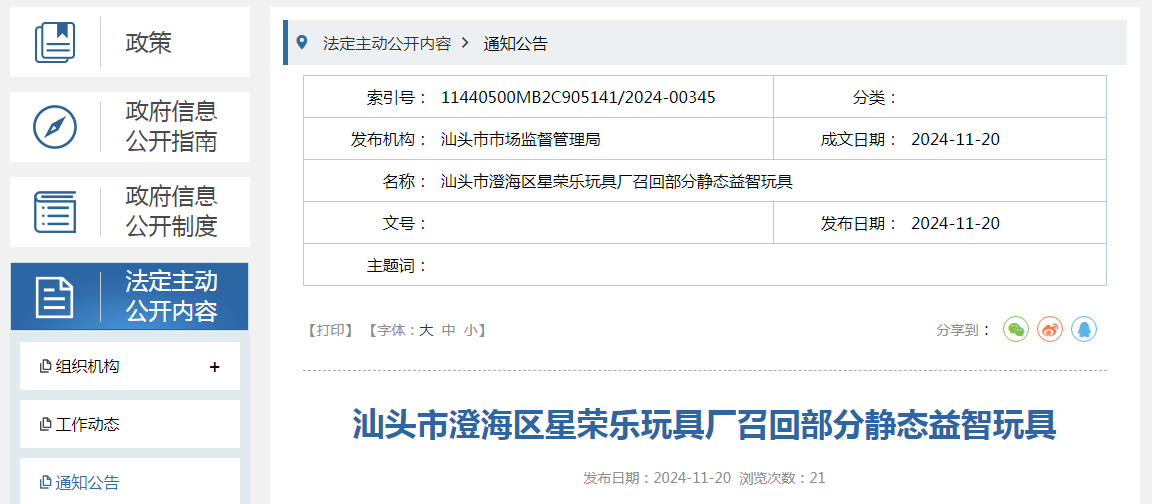 中國質量新聞網(wǎng)訊 據(jù)廣東省汕頭市市場監(jiān)督管理局網(wǎng)站消息,日前,汕頭市澄海區(qū)星榮樂玩具廠按照《消費品召回管理暫行規(guī)定》的要求,主動向汕頭市市場監(jiān)督管理局報告了召回計劃,將自即日起,召回2021年8月10日制造的部分靜態(tài)益智玩具,型號:YZ129—5,涉及數(shù)量為108盒。