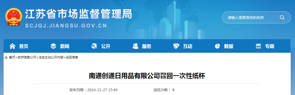 中國質(zhì)量新聞網(wǎng)訊 日前,南通創(chuàng)通日用品有限公司按照《消費品召回管理暫行規(guī)定》《江蘇省缺陷消費品召回管理辦法》的要求,主動向江蘇省市場監(jiān)督管理局和南通市市場監(jiān)督管理局報告了召回計劃,自即日起,召回3款一次性紙杯產(chǎn)品,共涉及數(shù)量43390件:2023年4月1日至2023年5月26日期間制造的205ml圣誕節(jié)紙杯,涉及數(shù)量為30250件;2024年3月7日制造的205ml萬圣節(jié)紙杯,涉及數(shù)量為1040件;2023年5月11日制造的205ml加厚牛皮紙杯,涉及數(shù)量為12100件。