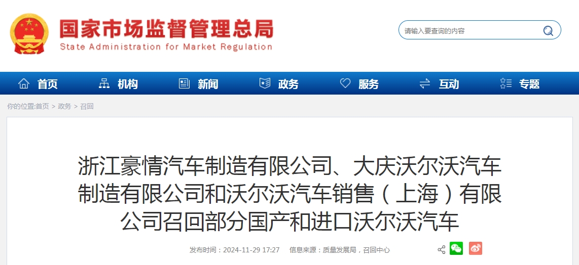 日前,浙江豪情汽車制造有限公司、大慶沃爾沃汽車制造有限公司和沃爾沃汽車銷售(上海)有限公司根據《缺陷汽車產品召回管理條例》和《缺陷汽車產品召回管理條例實施辦法》的要求,向國家市場監(jiān)督管理總局備案了召回計劃,決定自即日起召回以下車輛。
