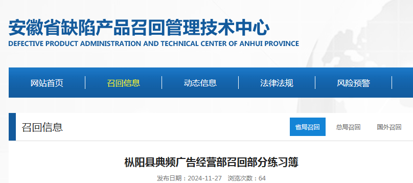 中國質(zhì)量新聞網(wǎng)訊 據(jù)安徽省缺陷產(chǎn)品召回管理技術(shù)中心網(wǎng)站消息,日前,樅陽縣典頻廣告經(jīng)營部按照《消費(fèi)品召回管理暫行規(guī)定》的要求,主動向安徽省市場監(jiān)督管理局、銅陵市市場監(jiān)督管理局報告了召回計劃,將自即日起,召回2024年9月生產(chǎn)的練習(xí)簿,涉及數(shù)量為5000本。