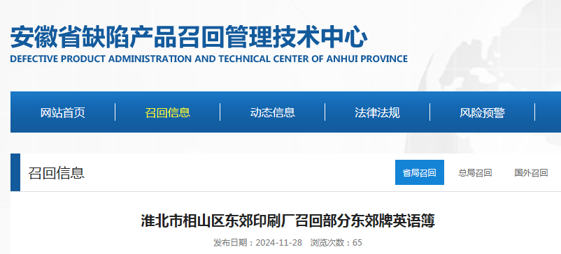 中國(guó)質(zhì)量新聞網(wǎng)訊 據(jù)安徽省缺陷產(chǎn)品召回管理技術(shù)中心網(wǎng)站消息,日前,淮北市相山區(qū)東郊印刷廠按照《消費(fèi)品召回管理暫行規(guī)定》的要求,主動(dòng)向安徽省市場(chǎng)監(jiān)督管理局、淮北市市場(chǎng)監(jiān)督管理局備案了召回計(jì)劃,決定自即日起,召回2024年8月16日生產(chǎn)的東郊牌英語(yǔ)簿,規(guī)格:190*265mm,內(nèi)芯14張,涉及數(shù)量52000冊(cè)。