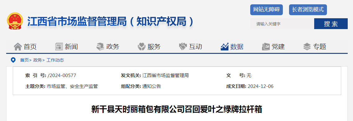 中國質(zhì)量新聞網(wǎng)訊 據(jù)江西省市場監(jiān)管局網(wǎng)站消息,日前,新干縣天時麗箱包有限公司按照《消費品召回管理暫行規(guī)定》的要求,主動向江西省市場監(jiān)督管理局報告了召回計劃,將自即日起,召回2024年1月-2024年4月期間制造的愛葉之綠牌20英寸旅行箱包,涉及數(shù)量為90只。